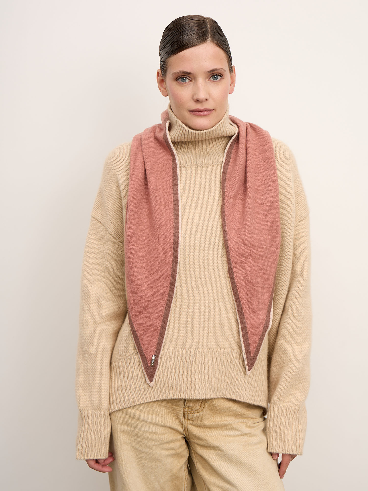 Модель выполнена в современном минималистичном стиле с аккуратной треугольной формой. Чистые линии и отсутствие лишних деталей делают шарф универсальным аксессуаром для разных образов.