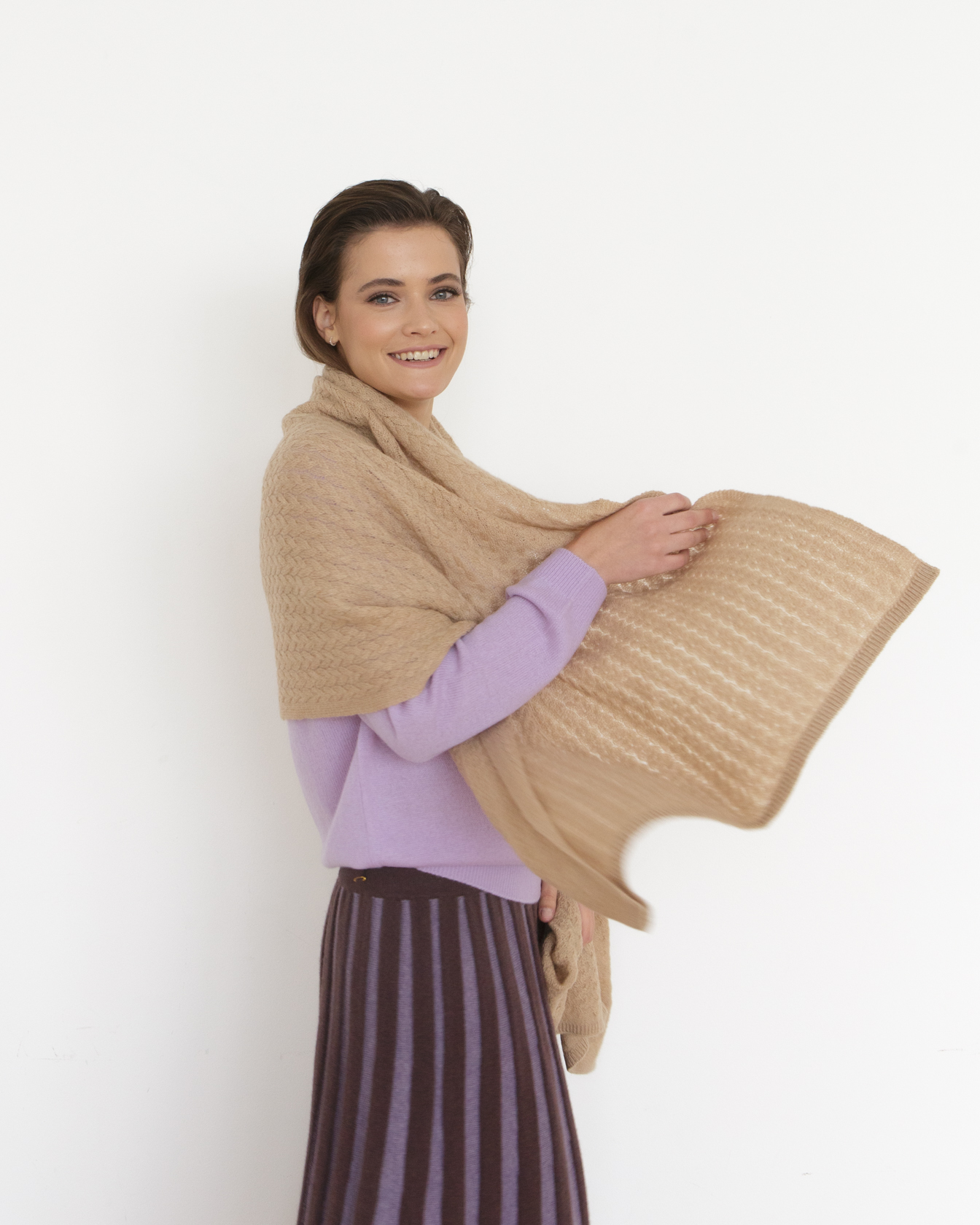 Классическая прямоугольная форма с аккуратной фактурной вязкой. Лаконичный дизайн подчеркивает натуральную красоту материала и делает палантин универсальным элементом гардероба.