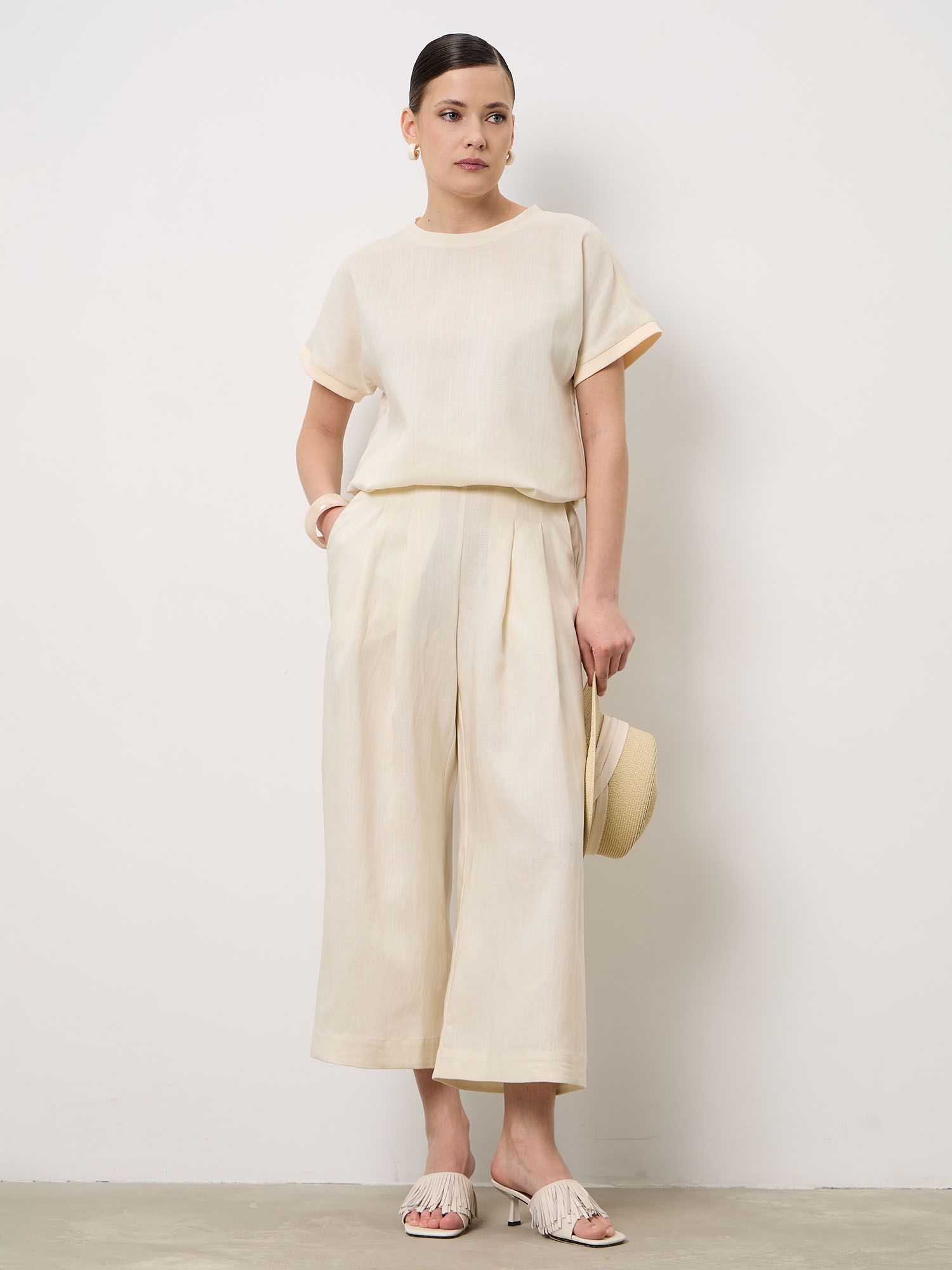Свободная посадка обеспечивает комфорт и свободу движений. Лёгкая натуральная ткань приятно ощущается на коже и подходит для длительной носки в течение дня.