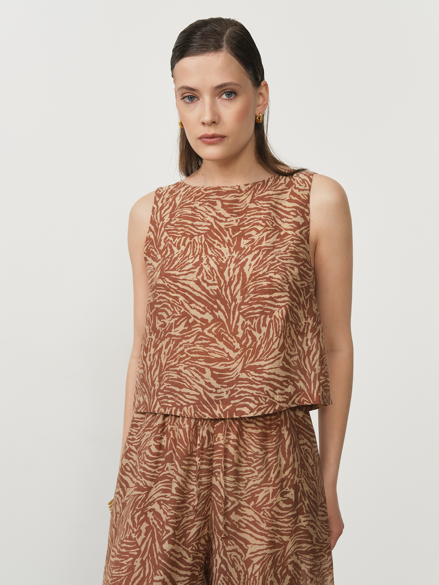 Топ из лиоцелла — стильная и лёгкая модель с выразительным принтом, которая добавляет образу динамику и индивидуальность. Отлично подходит для создания современных летних комплектов.