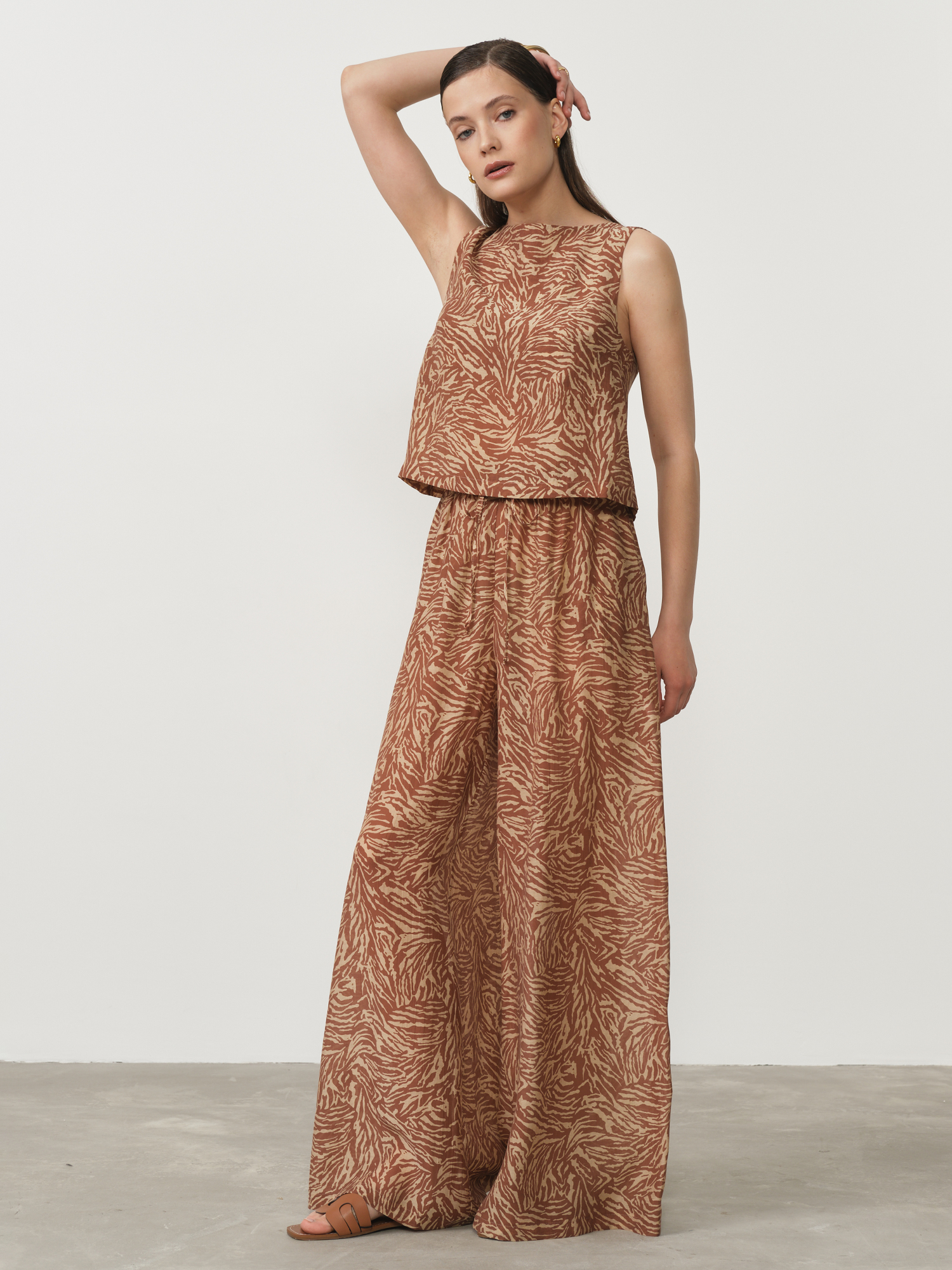 Коричневый с принтом — тёплый природный оттенок с графичным рисунком, придающим образу оригинальность.