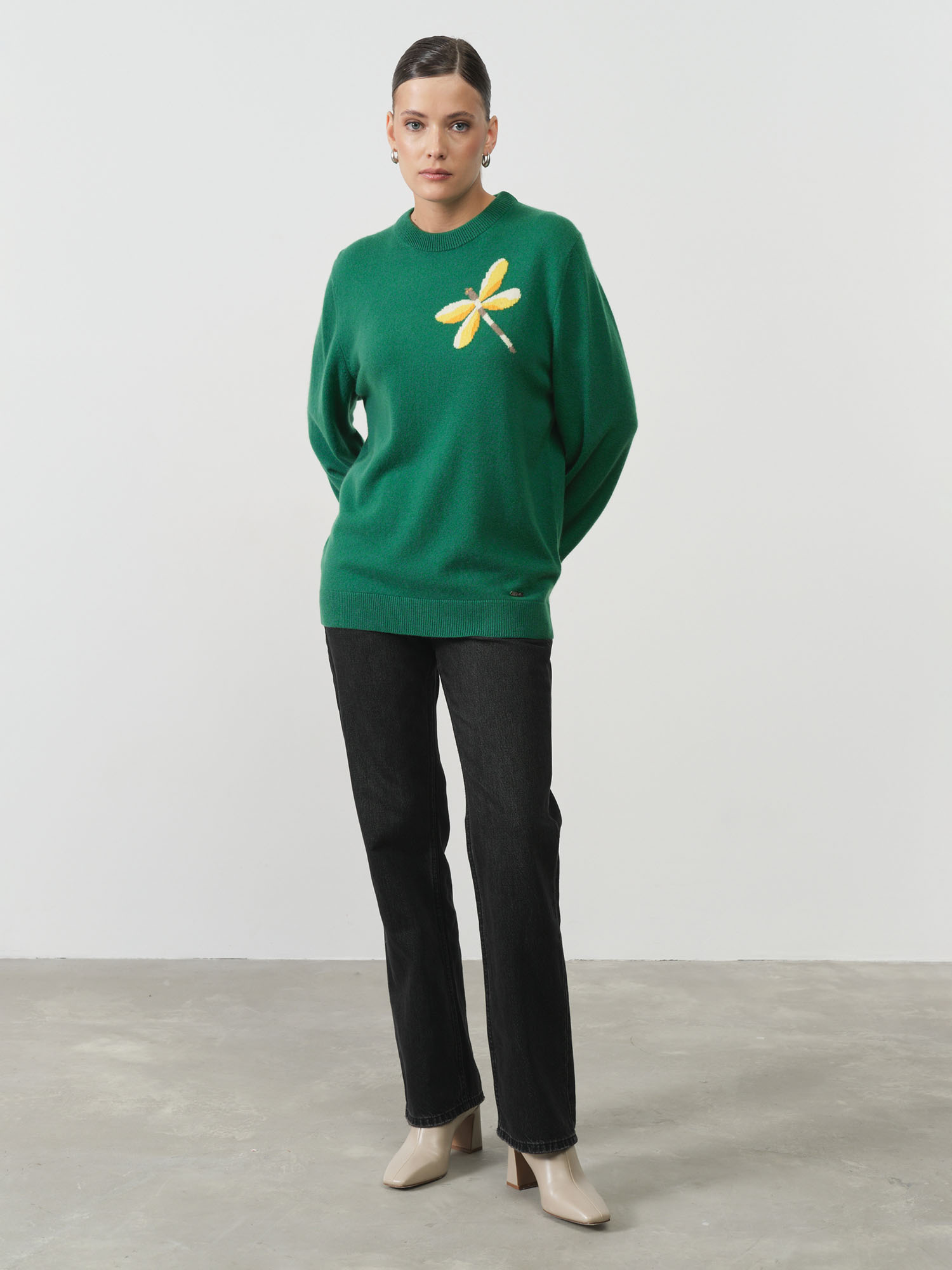 Прямой силуэт с круглым вырезом горловины. Акцент в виде декоративного узора (стрекоза) добавляет выразительности и делает модель стильным акцентом образа.