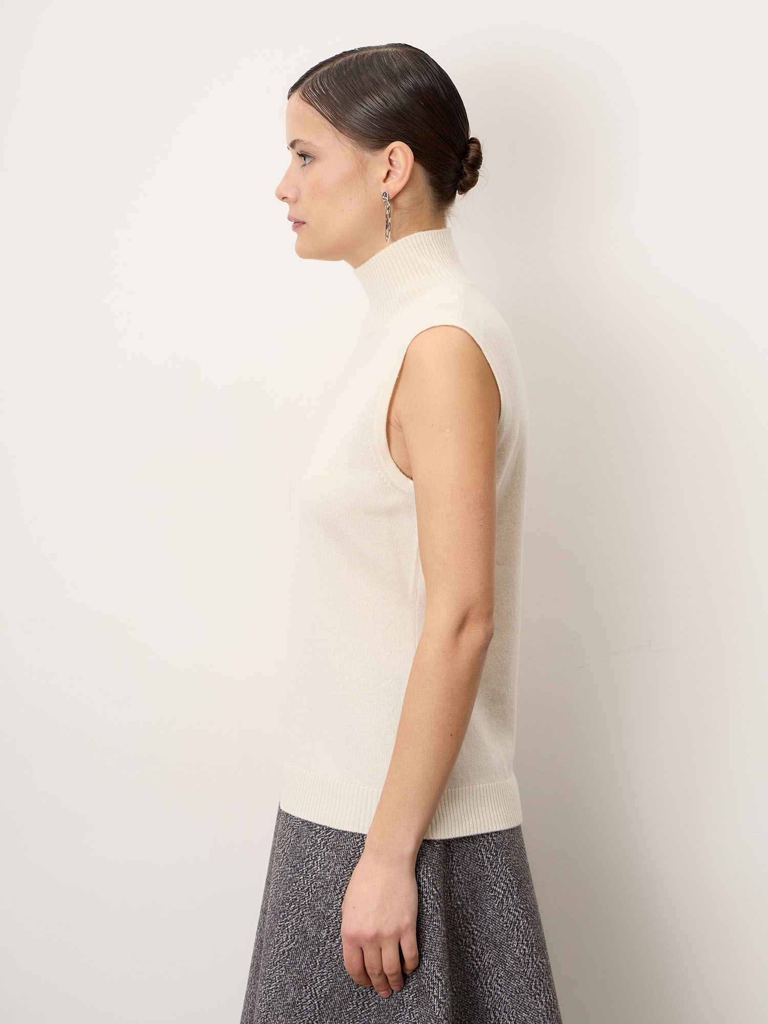 Прямой силуэт с высоким воротом и отсутствием рукавов. Лаконичный крой подчеркивает современный стиль и универсальность модели.