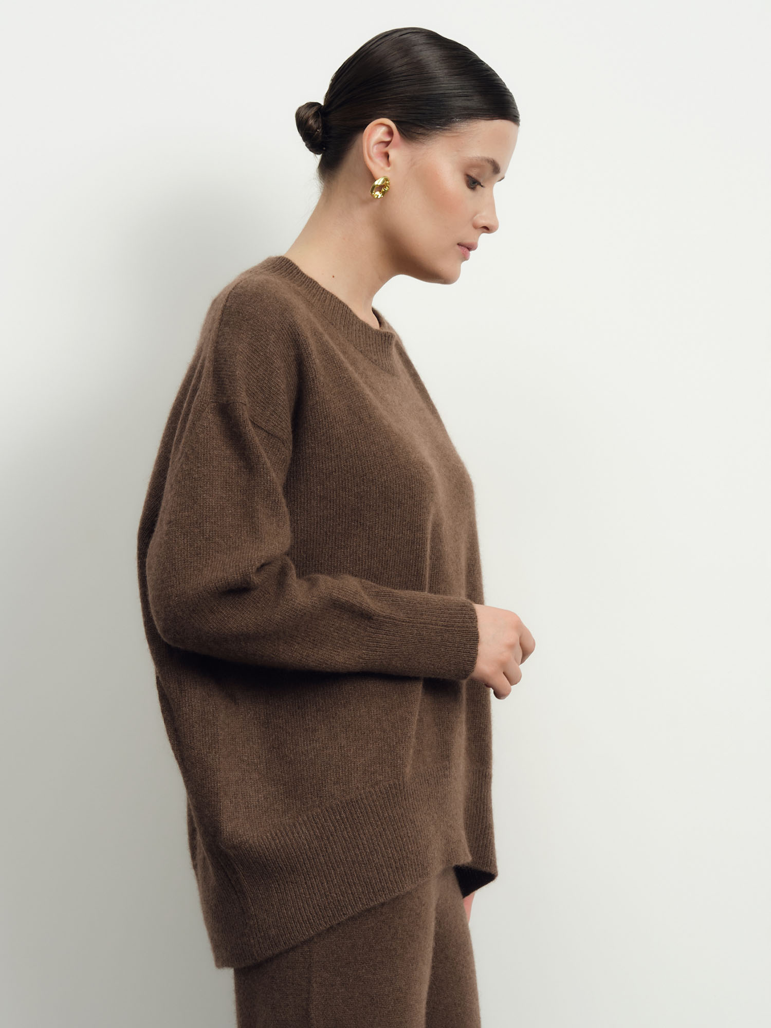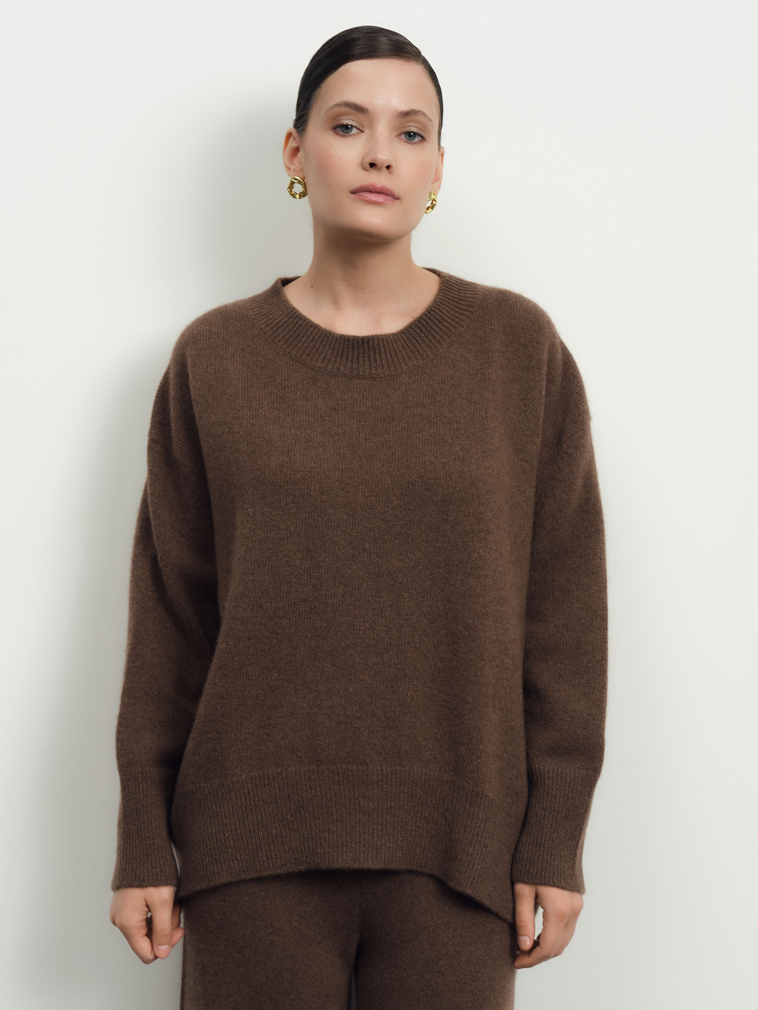 Модель выполнена в минималистичном стиле с круглой горловиной и гладкой вязкой. Прямой силуэт и лаконичные линии подчёркивают благородную фактуру натурального материала.