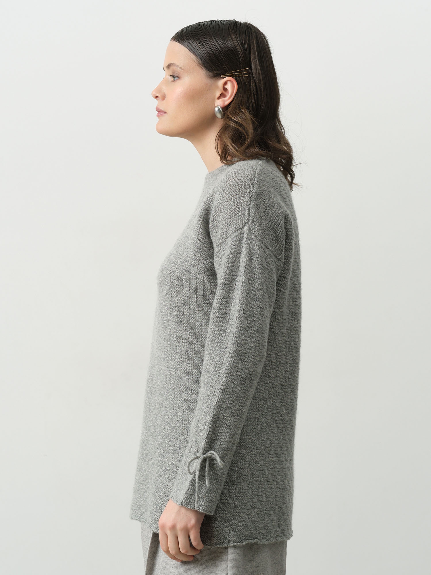 Круглый вырез горловины, длинные рукава с декоративными завязками по низу, аккуратная обработка краёв. Минималистичный дизайн делает модель универсальной для повседневных образов.
